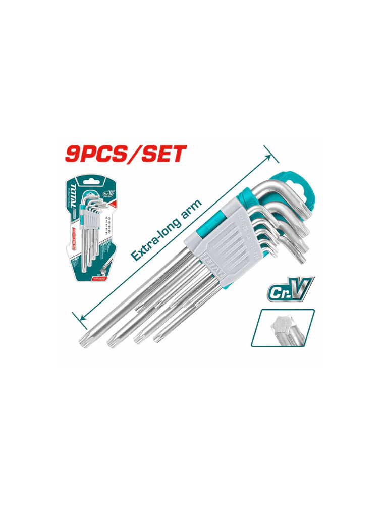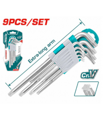 Ce kit comprend 9 clés Torx, allant de T10 à T50, parfaites pour une variété d'applications. Chaque clé dispose d'un bras extra-long qui facilite l'accès aux vis dans des espaces restreints, tout en offrant un couple de serrage optimal.