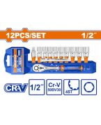 Jeu de 12 douilles 1/2" Inclure: Douille 10 pièces : 10-11-12-13-14-15-17-19-21-24 mm. 1 poignée à cliquet à dégagement rapide 1/2" 45T. 1 barre d'extension 1/2" : 3" (75 mm). Matériau : acier CrV 50BV30 de haute qualité. Traitement thermique Chromé Emballé par cintre en plastique